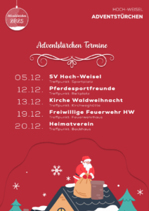 Ab dem 5. Dezember laden verschiedene Hoch-Weiseler Vereine jeweils Freitags und Samstags ab 17 Uhr zu stimmungsvollen Treffen an ihren „Adventstürchen“ ein.