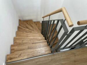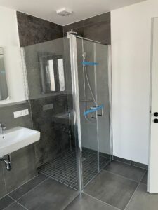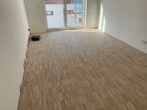 Die Treppen sind bereits fertig montiert, das Parkett verlegt und die Bäder haben mittlerweile auch Gestalt angenommen.