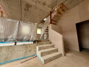 „Im Hoch-Weiseler Ortskern schreiten die Bauarbeiten an unserem Projekt kontinuierlich voran. In Haus 3 sind die Tapezier- und Anstricharbeiten bereits abgeschlossen, derzeit werden dort die Fliesen verlegt. In Haus 2 führt aktuell die Firma Baudekoration Ibrisimovic die Tapezier- und Anstricharbeiten aus, während die Firma GeHo Fliesen für die Fliesenarbeiten zuständig ist. Parallel dazu wird an den Häusern 2 und 3 derzeit der Außenputz aufgetragen.