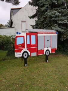 So wurde in vielen Arbeitsstunden, mit Werkzeug, Farbe und jeder Menge Teamgeist, das „Bücher-Feuerwehrauto“ gebaut. Als Vorbild wurde dabei das aktuelle Fahrzeug der Freiwilligen Feuerwehr Hoch-Weisel genommen.