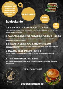 J’S Genussmobil steht für hochwertige Focaccia- und Ciabatta-Sandwiches mit Premium-Zutaten, größtenteils direkt aus Italien – darunter originaler Parmaschinken, feinster Mozzarella und ausgewählte Öle. Qualität, Frische und authentischer Geschmack stehen klar im Mittelpunkt.